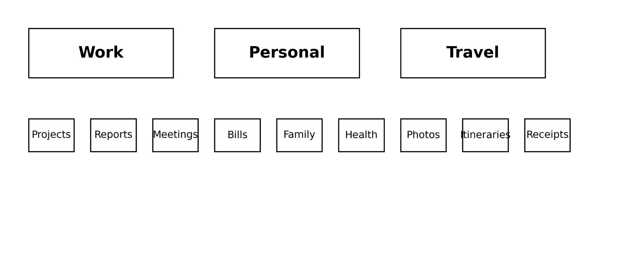 • 폴더와 서브폴더 만들기: 프로젝트나 목적에 따라 폴더를 만들고, 그 안에 서브폴더를 둡니다. 예를 들어 업무‧개인‧여행 폴더를 만들고 각각의 하위 폴더로 보고서, 회의록, 사진 등을 나눌 수 있습니다. 아래 이미지처럼 구조화하면 SNS용 자료나 업무 자료를 빠르게 찾을 수 있습니다.